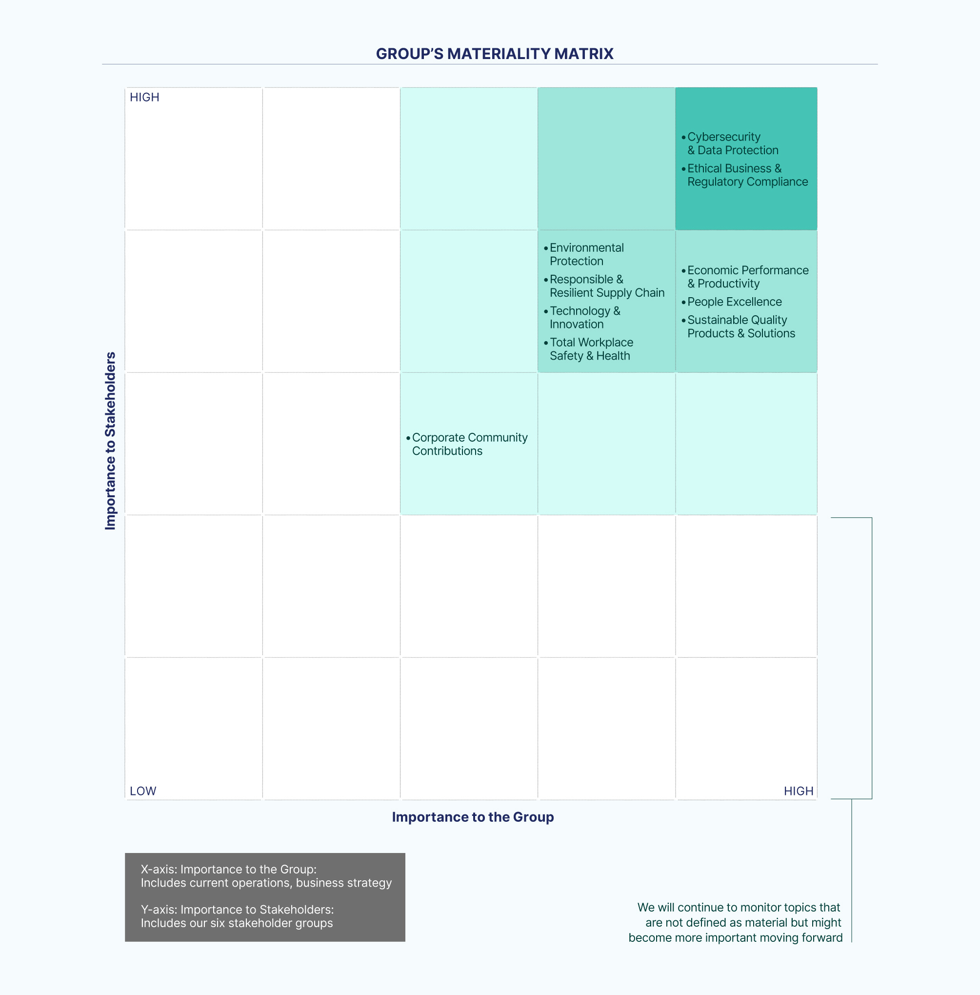 Materiality sets an important foundation for the Group’s Sustainability Approach. Assessing our material areas of focus in sustainability enables us to optimise sustainable value for all our stakeholders, which is essential to the Group’s long-term success.
